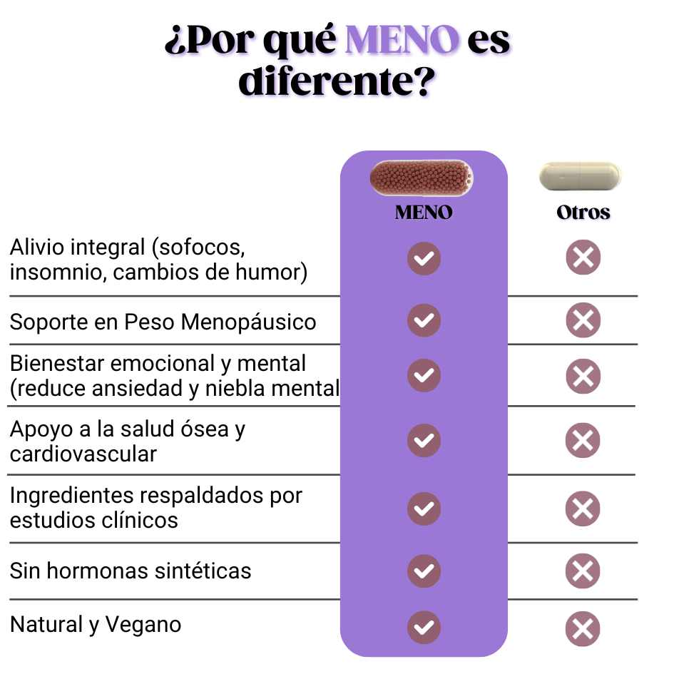 Respuesta: MENO está formulado con ingredientes naturales y no presenta efectos secundarios graves. Algunas personas pueden notar una leve sensación de energía aumentada, lo cual es completamente normal y positivo.